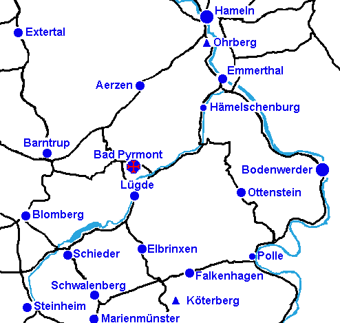 | Auf der nachfolgenden Kartenskizze finden Sie die wichtigsten Ausflugsziele im Umkreis von 25 Kilometern. Ein Klick auf die Ortsnamen in der Landkarte öffnet unmittelbar die entsprechende Datei. Die alphabetische Link-Liste auf der rechten Bildschirmseite zeigt in Klammern die jeweilige Fahrtstrecke ab der Touristeninformation in Bad Pyrmont. | |