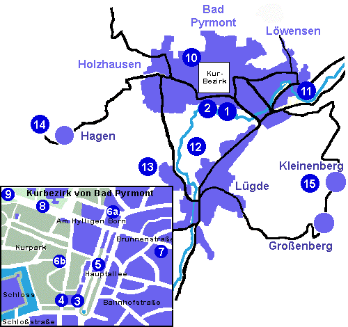 | Auf der nachfolgenden Kartenskizze finden Sie die wichtigsten Freizeitangebote in Bad Pyrmont. Ein Klick auf die Ziffer in der Landkarte öffnet unmittelbar die entsprechende Datei. Alternativ können Sie die alphabetische Link-Liste auf der rechten Bildschirmseite für die Navigation benutzen. | |